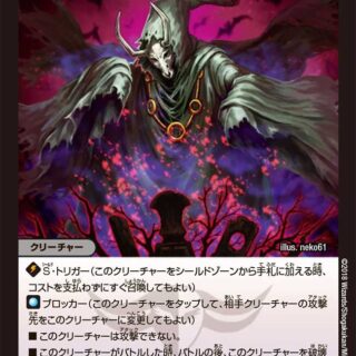 ブロッカー(このクリーチャーをタップして、相手クリーチャーの攻撃先をこのクリーチャーに変更してもよい)W・ブレイカー(このクリーチャーはシールドを2つブレイクする)このクリーチャーがバトルゾーンに出た時、カードを1枚、自分のマナゾーンから山札の上に置く。
