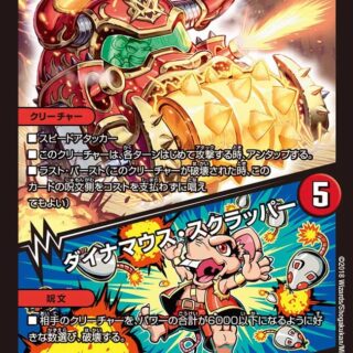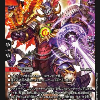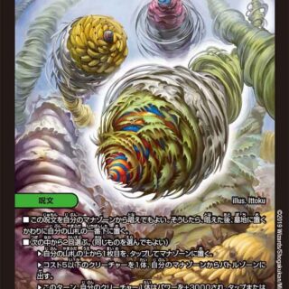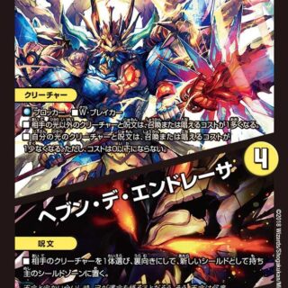 ムゲンクライム 3(自分のクリーチャーを3体タップし、 [dd03]支払って、このクリーチャーを自分の手札または墓地から召喚してもよい)W・ブレイカーこのクリーチャーが攻撃する時、相手のクリーチャーを1体破壊する。それができなければ、相手は自身の山札の上から5枚を墓地に置く。
