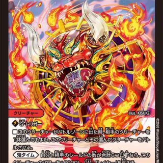 Q・ブレイカーこのクリーチャーは攻撃できない。鬼タイム :自分と相手のシールドの数が合計6つ以下なら、真上の▪️能力を無視する。自分のターンのはじめに、自分のシールドを1つ手札に加える。ただし、その「S・トリガー」は使えない。