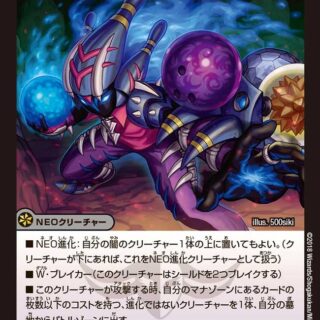 ビビッドロー [ww04](自分のターン中、攻撃の前にこのクリーチャーをドローした時、表向きにしてもよい。そうしたら、このターンこのクリーチャーを [ww04]支払って召喚してもよい)W・ブレイカー(このクリーチャーはシールドを2つブレイクする)このクリーチャーがバトルゾーンに出た時、相手のクリーチャーを2体まで選ぶ。次の自分のターンのはじめまで、それらは攻撃もブロックもできない。相手がクリーチャーを選ぶ時、このクリーチャーは選べない。(ただし、このクリーチャーを攻撃またはブロックしてもよい)