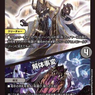 キリフダッシュ [ff02](自分のクリーチャーの攻撃の終わりに、そのクリーチャーがその攻撃中にシールドをブレイクしていれば、このクリーチャーを[ff02]支払って召喚してもよい)このクリーチャーがバトルゾーンに出た時、相手のマナゾーンにあるカードの枚数よりコストが大きい相手のクリーチャーをすべて破壊する。