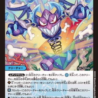 ムゲンクライム 4(自分のクリーチャーを4体タップし、 [wd04]支払って、このクリーチャーを自分の手札または墓地から召喚してもよい)T・ブレイカーこのクリーチャーがバトルゾーンに出た時、相手のクリーチャーを3体まで選び、持ち主の手札に戻す。このクリーチャーが攻撃する時、相手の手札を3枚見ないで選び、捨てさせる。