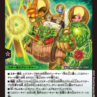 マナ武装 5:自分のターンの終わりに、自分のマナゾーンに闇のカードが5枚以上あれば、相手は自身の手札から1枚選び、残りを捨てる。
