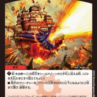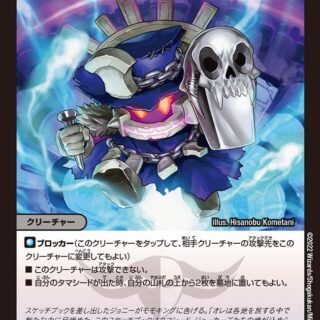 S・トリガーブロッカーこのクリーチャーは攻撃することができない。このクリーチャーをバトルゾーンに出した時、プレイヤーを一人選ぶ。そのプレイヤーは、自身の墓地のカードをすべて山札に加え、シャッフルする。