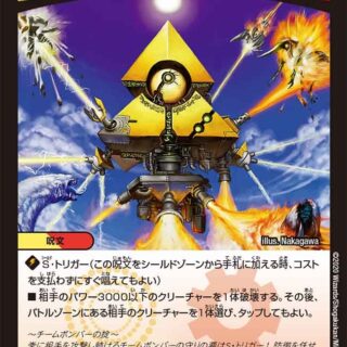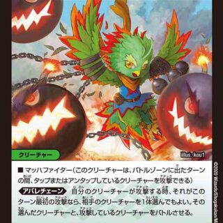 パワード・ブレイカー(このクリーチャーは、そのパワー6000ごとにシールドをさらに1つブレイクする)このクリーチャーがバトルゾーンに出た時、自分の山札の上から2枚を墓地に置く。自分の墓地にあるカード1枚につき、このクリーチャーのパワーを+1000する。フシギバース [dn06](自分のクリーチャーを1体タップしてマナゾーンに置き、 [dn06] からそのクリーチャーのコストを引いた数のコストを支払って、このクリーチャーを自分の墓地から召喚してもよい。ただし、コストは[dn02]より少なくならない)
