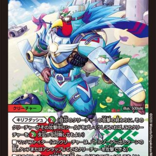 ブロッカーW・ブレイカーマジボンバー 6(このクリーチャーが攻撃する時、自分の山札の上から1枚目を見る。その後、コスト6以下のクリーチャーを1体、自分の手札または山札の上から、バトルゾーンに出してもよい)自分の他のクリーチャーがバトルゾーンに出た時、このターン、このクリーチャーはすべてのバトルに勝つ。
