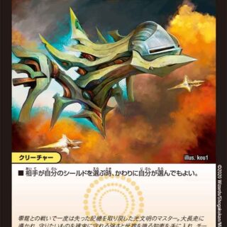 ギャラクシールド [ww02](このカードを使うコストの代わりに、[ww02]を支払ってもよい。そうしたら、このカードを表向きにし、新しいシールドとしてシールドゾーンに置く)自分のターンのはじめに、このクリーチャーが表向きで自分のシールドゾーンにあれば、コストを支払ったものとして召喚する。ブロッカーこのクリーチャーが表向きでシールドゾーンに置かれた時、またはバトルゾーンに出た時、相手のクリーチャーを1体選ぶ。次の自分のターンのはじめまで、そのクリーチャーは攻撃もブロックもできない。
