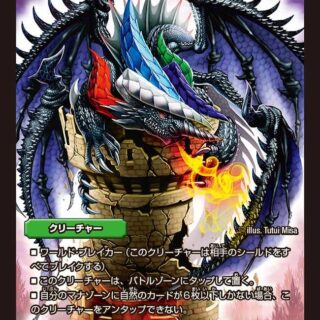 W・ブレイカー自分のターンの終わりに、カードを1枚引いてもよい。その後、光のコスト3以下のクリーチャーを1体、自分の手札から出してもよい。自分のターンのはじめに、自分のD2フィールドと、自分の同じ名前のクリーチャーが4体以上あれば、自分はゲームに勝つ。