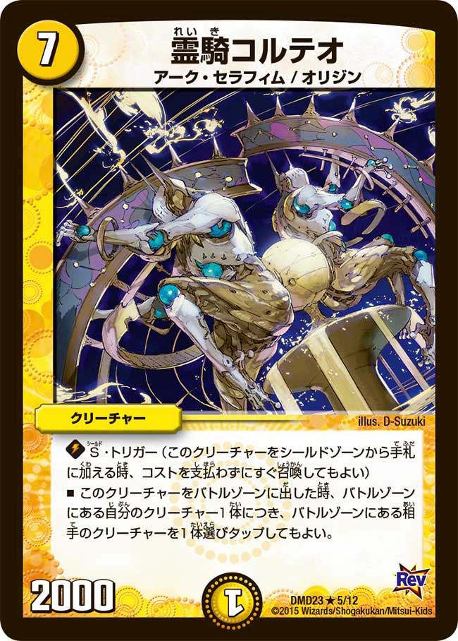 S・トリガー(このクリーチャーをシールドゾーンから手札に加える時、コストを支払わずにすぐ召喚してもよい)このクリーチャーをバトルゾーンに出した時、バトルゾーンにある自分のクリーチャー1体につき、バトルゾーンにある相手のクリーチャーを1体選びタップしてもよい。