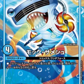 マーシャル・タッチ(このクリーチャーがバトルゾーンに出た時、自分の他のクリーチャーを1体、バトルゾーンから手札に戻してもよい。そうしたら、 このクリーチャーの g能力を使う)gこのターン、自分のクリーチャーすべてに「スピードアタッカー」を与える。(「スピードアタッカー」を持つクリーチャーは召喚酔いしない)