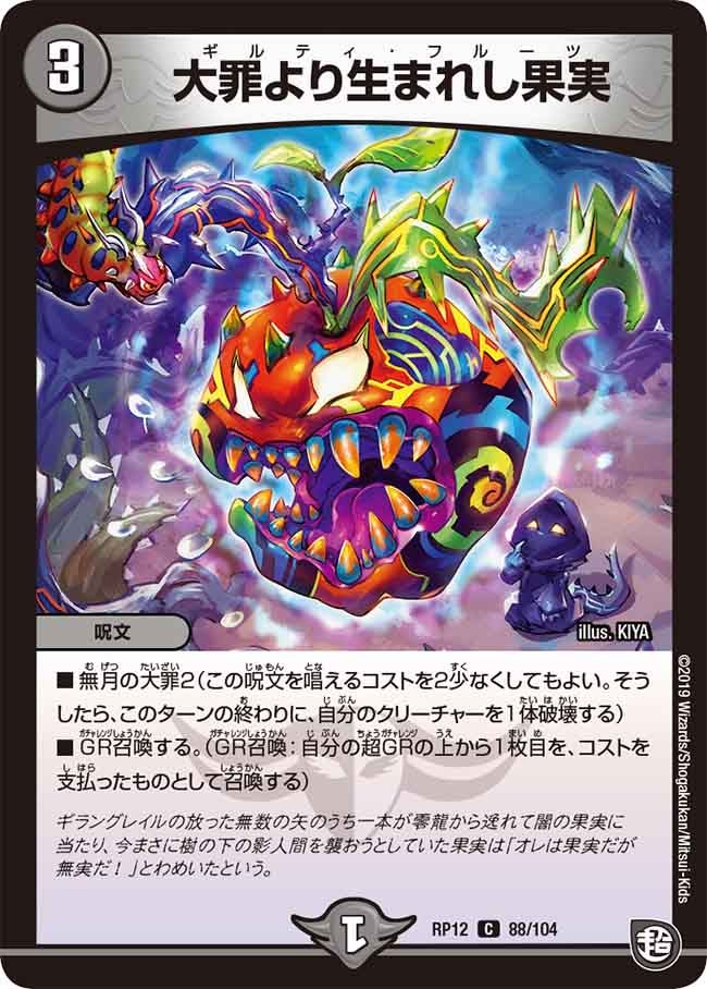 無月の大罪2(この呪文を唱えるコストを2少なくしてもよい。そうしたら、このターンの終わりに、自分のクリーチャーを1体破壊する)GR召喚する。(GR召喚:自分の超GRの上から1枚目を、コストを支払ったものとして召喚する)