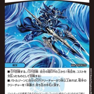 W・ブレイカーこのクリーチャーがバトルゾーンに出た時、GR召喚する。バトルゾーンにある自分のジョーカーズ1枚につき、自分の呪文を唱えるコストを1少なくする。ただし、コストは0以下にならない。自分の手札から呪文を唱えた時、その呪文をもう一度、コストを支払わずに墓地から唱えてもよい。