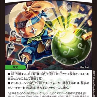 S・トリガー(このクリーチャーをシールドゾーンから手札に加える時、コストを支払わずにすぐ召喚してもよい)スマッシュ・バースト(このクリーチャーが攻撃する時、このカードの呪文側を、バトルゾーンに置いたままコストを支払わずに唱えてもよい)