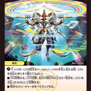 S・トリガー(この呪文をシールドゾーンから手札に加える時、コストを支払わずにすぐ唱えてもよい)GR召喚する。(GR召喚:自分の超GRの上から1枚目を、コストを支払ったものとして召喚する)バトルゾーンに自分のGRクリーチャーが3体以上あれば、相手のクリーチャーをすべてタップする。次の相手のターンのはじめに、それらはアンタップしない。