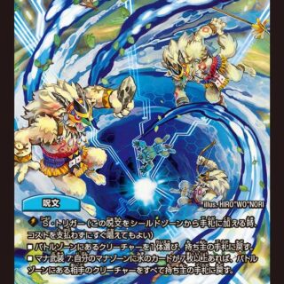 自分の自然のクリーチャーの召喚コストを1少なくしてもよい。ただし、コストは1より少なくならない。龍解:自分のターンのはじめに、バトルゾーンに自分の自然のクリーチャーが2体以上あれば、このドラグハートをクリーチャー側に裏返し、アンタップする。(ゲーム開始時、ドラグハートは自身の超次元ゾーンに置き、バトルゾーンを離れた場合、そこに戻す)