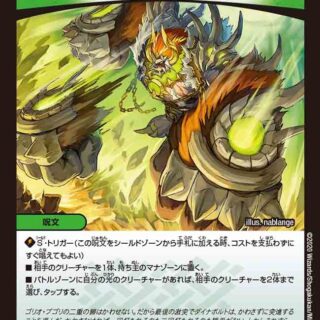 ブロッカー(このクリーチャーをタップして、相手クリーチャーの攻撃先をこのクリーチャーに変更してもよい)W・ブレイカー(このクリーチャーはシールドを2つブレイクする)相手のクリーチャーがバトルゾーンに出た時、このクリーチャーをアンタップする。