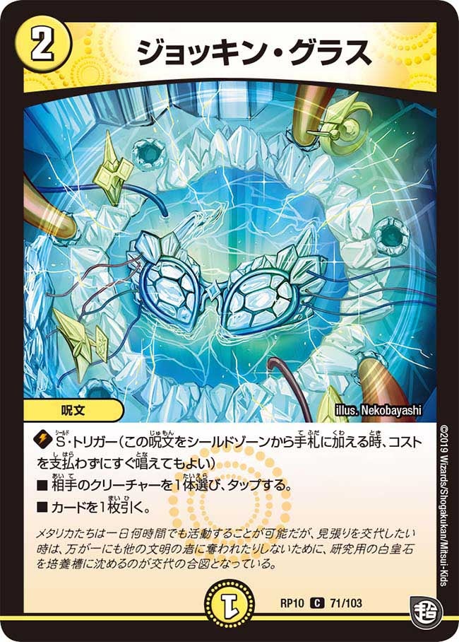 S・トリガー(この呪文をシールドゾーンから手札に加える時、コストを支払わずにすぐ唱えてもよい)相手のクリーチャーを1体選び、タップする。カードを1枚引く。