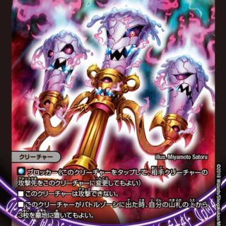 無月の大罪1(このオーラを使うコストを1少なくしてもよい。そうしたら、このターンの終わりに、自分のクリーチャーを1体破壊する)これをクリーチャーに付けた時、相手のクリーチャーを1体選ぶ。このターン、そのクリーチャーのパワーを -2000する。(パワー0以下のクリーチャーは破壊される)