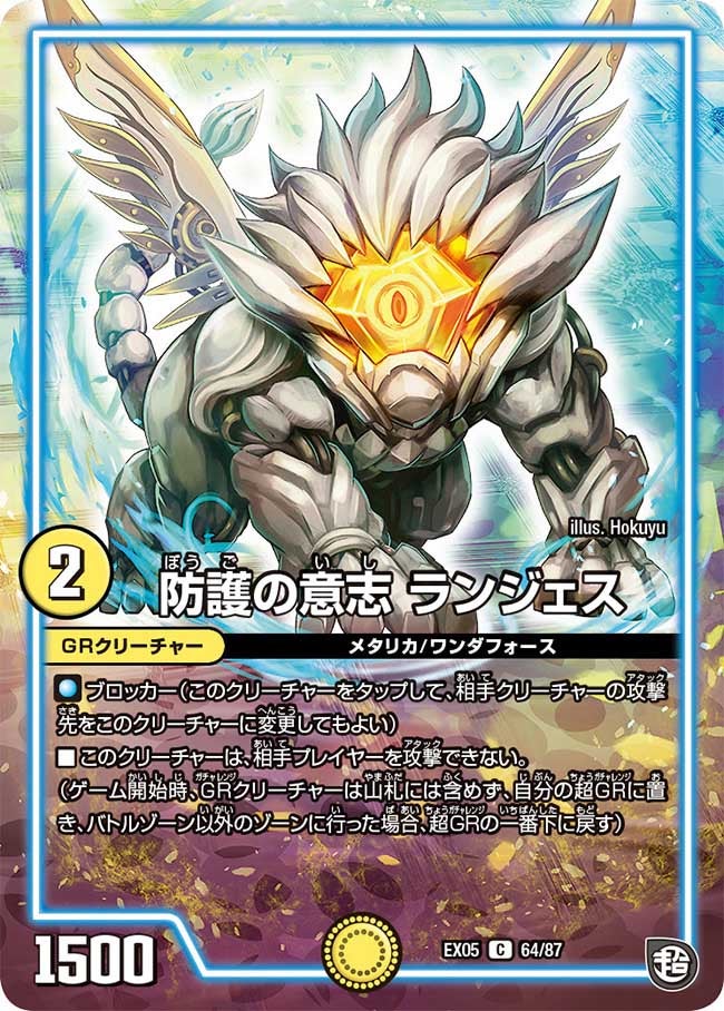 ブロッカー(このクリーチャーをタップして、相手クリーチャーの攻撃先をこのクリーチャーに変更してもよい)このクリーチャーは、相手プレイヤーを攻撃できない。(ゲーム開始時、GRクリーチャーは山札には含めず、自分の超GRに置き、バトルゾーン以外のゾーンに行った場合、超GRの一番下に戻す)