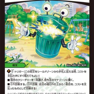 シンパシー:クリーチャー(このクリーチャーを召喚する時支払うコストは、バトルゾーンにある自分のクリーチャー1体につき1少なくなる。ただしコストは0以下にならない)W・ブレイカー(このクリーチャーはシールドを2つブレイクする)このクリーチャーが攻撃する時、自分の他のクリーチャーを2体、タップしてもよい。そうしたら、このターン、このクリーチャーはすべてのバトルに勝つ。