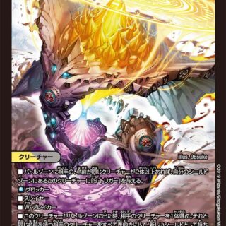 NEO進化:自分の光のコスト9のクリーチャー1体の上に置いてもよい。T・ブレイカーこのクリーチャーがバトルゾーンに出た時、それがNEO進化クリーチャーなら、光のコスト9のクリーチャーを9体まで、自分の手札または墓地からバトルゾーンに出す。