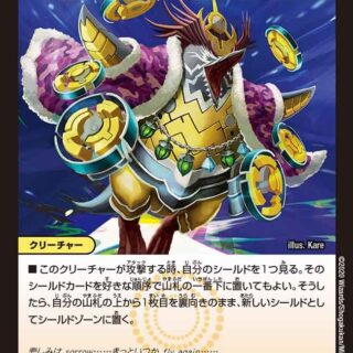 S・トリガー(このクリーチャーをシールドゾーンから手札に加える時、コストを支払わずにすぐ召喚してもよい)ブロッカー(このクリーチャーをタップして、相手クリーチャーの攻撃先をこのクリーチャーに変更してもよい)このクリーチャーは、相手プレイヤーを攻撃できない。