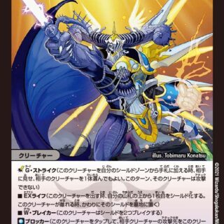 デッキ進化:自分の山札の上から1枚目を表向きにする。そのカードがクリーチャーなら、このクリーチャーをその上に重ねつつバトルゾーンに出す。クリーチャー以外なら、このクリーチャーを自分の手札に戻す。W・ブレイカーメテオバーン:このクリーチャーが攻撃する時、このクリーチャーの下に重ねたカードを1枚、墓地に置いてもよい。そうしたら、このクリーチャーよりパワーが小さい相手のクリーチャーをすべて破壊する。