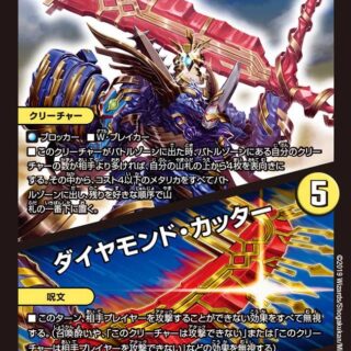 W・ブレイカーこのクリーチャーがバトルゾーンに出た時、シールドゾーンにある表向きのカードを合計3枚まで選び、持ち主の墓地に置く。相手のクリーチャーが攻撃またはブロックした時、相手は自身の他のクリーチャーを1体選び、破壊する。他のクリーチャーが破壊された時、カードを1枚引いてもよい。