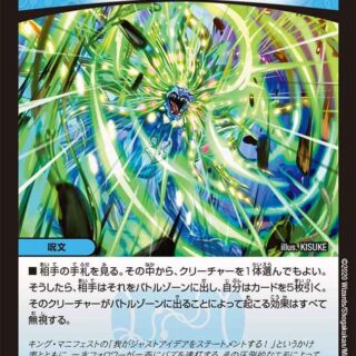 S・トリガー(この呪文をシールドゾーンから手札に加える時、コストを支払わずにすぐ唱えてもよい)相手のクリーチャーを1体、破壊する。この呪文を自分の手札から唱えた時、闇のカードを2枚、自分の手札から捨ててもよい。そうしたら、この呪文を自分の墓地からコストを支払わずに唱える。