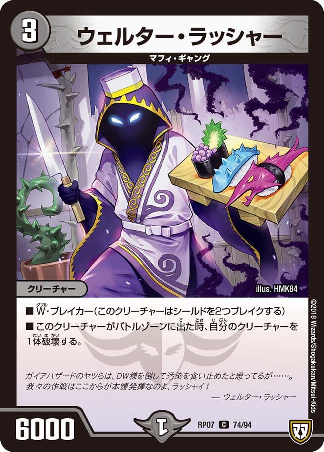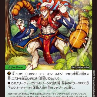 W・ブレイカー(このクリーチャーはシールドを2つブレイクする)このクリーチャーがバトルゾーンに出た時、自分のクリーチャーを1体破壊する。