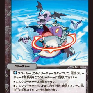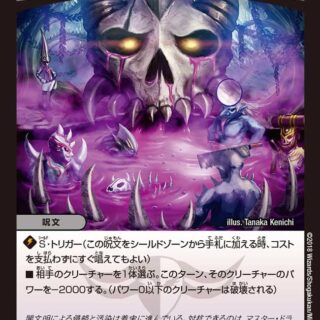 S・トリガー(この呪文をシールドゾーンから手札に加える時、コストを支払わずにすぐ唱えてもよい)クリーチャーを1体選ぶ。このターン、そのクリーチャーに「スレイヤー」を与える。(「スレイヤー」を持つクリーチャーがバトルする時、バトルの後、相手クリーチャーを破壊する)このターンの終わりに、選んだクリーチャーがこのターン中に攻撃していたら、それを破壊する。