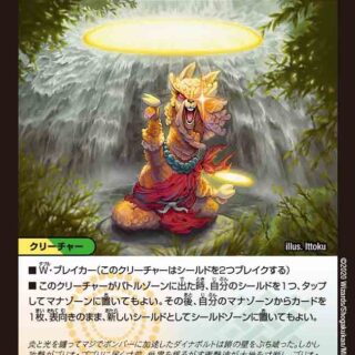 スーパー・S・トリガー(このクリーチャーを自分のシールドゾーンから手札に加える時、コストを支払わずにすぐ召喚してもよい。その時自分のシールドが1つもなければ、このクリーチャーにxB能力を与える)このクリーチャーがバトルゾーンに出た時、カードを2枚引いてもよい。そうしたら、自分の手札を2枚捨てる。xBこのクリーチャーがバトルゾーンに出た時、自分の墓地からコストが4以下の呪文を2枚まで選び、コストを支払わずに唱える。