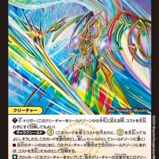 このクリーチャーがバトルゾーンに出た時、自分の山札の上から1枚目をマナゾーンに置く。自分のターン中に、コスト8以上のクリーチャーを召喚した時またはコスト8以上の呪文を唱えた時、相手のクリーチャーを1体選び、持ち主のマナゾーンに置く。
