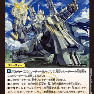 S・トリガー(このクリーチャーをシールドゾーンから手札に加える時、コストを支払わずにすぐ召喚してもよい)ブロッカー(このクリーチャーをタップして、相手クリーチャーの攻撃先をこのクリーチャーに変更してもよい)このクリーチャーは攻撃できない。
