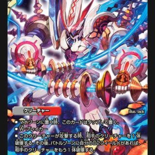 マナゾーンに置く時、このカードはタップして置く。このクリーチャーを召喚する時、自分のクリーチャーを好きな数破壊してもよい。こうして破壊したクリーチャー1体につき、このクリーチャーの召喚コストを5少なくする。ただし、コストは4以下にならない。スピードアタッカーQ・ブレイカーこのクリーチャーが攻撃する時、相手の光のクリーチャー、水のクリーチャー、闇のクリーチャー、火のクリーチャー、自然のクリーチャーを1体ずつ破壊する。