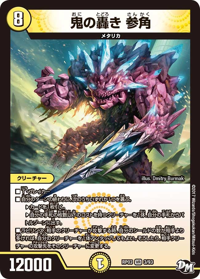 T・ブレイカー自分のターンの終わりに、次のうちいずれか1つを選ぶ。??カードを1枚引く。??自分の手札の枚数以下のコストを持つクリーチャーを1体、自分の手札からバトルゾーンに出す。ラビリンス:相手のクリーチャーが攻撃する時、自分のシールドの数が相手より多ければ、自分のクリーチャーを1体アンタップしてもよい。そうしたら、相手クリーチャーの攻撃先をそのクリーチャーに変更する。