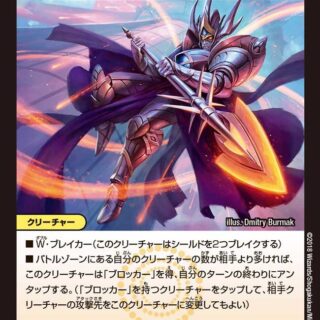 ガードマン(このクリーチャーをタップして、相手クリーチャーの攻撃先を、自分の他のクリーチャーからこのクリーチャーに変更してもよい)このクリーチャーは、相手プレイヤーを攻撃できない。このクリーチャーがバトルに勝った時、相手のシールドを1つブレイクする。