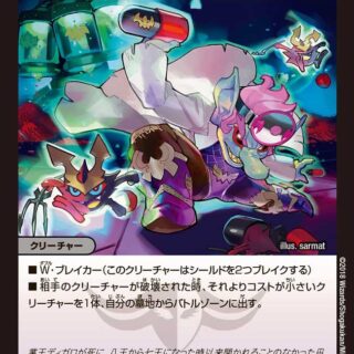 シールド・セイバー(自分のシールドがブレイクされる時、かわりにこのクリーチャーを破壊してもよい)このクリーチャーがバトルゾーンを離れた時、相手のクリーチャーを1体選び、持ち主のマナゾーンに置く。