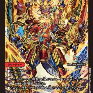 進化ー自分の光のコマンド1体の上に置く。ブロッカーこのクリーチャーをバトルゾーンに出した時、または自分のシールドの最後の1枚がブレイクされた時、バトルゾーンにある相手のクリーチャーをすべてタップする。次の相手のターンのはじめに、そのクリーチャーはアンタップされない。T・ブレイカー(このクリーチャーはシールドを3枚ブレイクする)