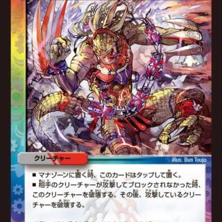 S・トリガー(このクリーチャーをシールドゾーンから手札に加える時、コストを支払わずにすぐ召喚してもよい)バトルゾーンに出す時、このクリーチャーはタップして置く。相手の攻撃クリーチャーは、可能であればこのクリーチャーを攻撃する。このクリーチャーがバトルする時、バトルの後、このクリーチャーと相手のクリーチャーを破壊する。