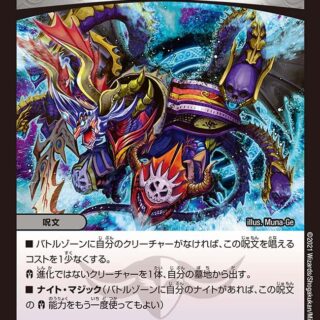 S・トリガー(このD2フィールドをシールドゾーンから手札に加える時、コストを支払わずにすぐ展開してもよい)相手のクリーチャーが攻撃する時、相手は自身のアンタップしているクリーチャーを1体選び、持ち主のマナゾーンに置く。(他のD2フィールドがバトルゾーンに出た時、このD2フィールドを自分の墓地に置く)**Dスイッチ:自分のターンのはじめに、このD2フィールドをゲーム中で一度上下逆さまにしてもよい。そうしたら、自分の山札の上から1枚目をマナゾーンに置く。そのコストが、相手のマナゾーンにあるカードの枚数より小さいクリーチャーなら、バトルゾーンに出す。