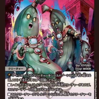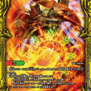 進化:自分の火または自然のクリーチャー1体の上に置く。W・ブレイカーメテオバーン:このクリーチャーが攻撃する時、このクリーチャーの下にあるカードを1枚、墓地に置いてもよい。そうしたら、カードを3枚引く。自分のターンのはじめに、進化ではないクリーチャーを1体、自分の手札からこのクリーチャーの下に置いてもよい。