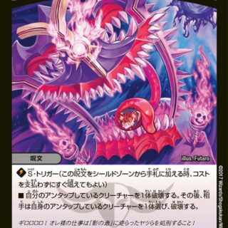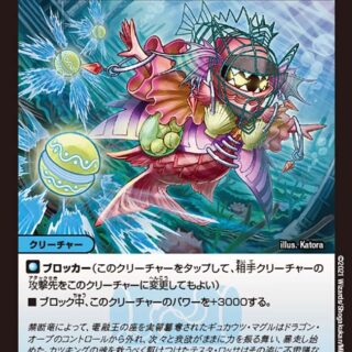 マナゾーンに置く時、このカードはタップして置く。S・トリガー(このクリーチャーをシールドゾーンから手札に加える時、コストを支払わずにすぐ召喚してもよい)ブロッカー(このクリーチャーをタップして、相手クリーチャーの攻撃先をこのクリーチャーに変更してもよい)パワーアタッカー+2000(攻撃中、このクリーチャーのパワーを+2000する)このクリーチャーは、相手プレイヤーを攻撃できない。