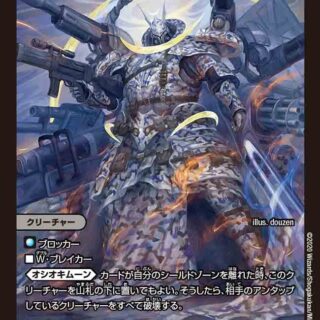 W・ブレイカーこのクリーチャーがバトルゾーンに出た時、自分のクリーチャーを1体、破壊してもよい。そうしたら、カードを2枚引く。このクリーチャーまたは自分の他のクリーチャーが破壊された時、バトルゾーンに自分のD2フィールドがあれば、相手のクリーチャーを1体、破壊する。