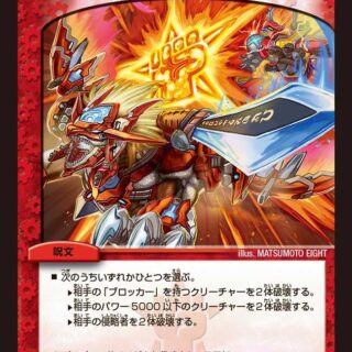 自分のクリーチャーが破壊された時、相手のクリーチャーを1体選ぶ。そのターン、そのクリーチャーのパワーを?4000する。(パワー0以下のクリーチャーは破壊される)(他のD2フィールドがバトルゾーンに出た時、このD2フィールドを自分の墓地に置く)**Dスイッチ:自分のターンの終わりに、このD2フィールドをゲーム中で一度上下逆さまにしてもよい。そうしたら、そのターン中に破壊された自分のクリーチャーをすべて、墓地からバトルゾーンに戻してもよい。