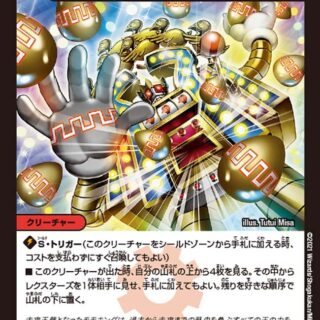革命0トリガー―クリーチャーが自分を攻撃する時、自分のシールドがひとつもなければ、この呪文をコストを支払わずに唱えてもよい。自分の山札の上から1枚目を表向きにする。それが自然のクリーチャーなら、相手のクリーチャーを1体選び、持ち主のマナゾーンに置く。この呪文を唱えた後、墓地に置くかわりに自分の山札に加えてシャッフルする。
