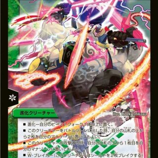 進化-自分の「コマンド」と種族にあるクリーチャー1体の上に置く。このクリーチャーをバトルゾーンに出した時、コスト7以下のサイキック・クリーチャーを1体、自分の超次元ゾーンからバトルゾーンに出してもよい。このクリーチャーがバトルゾーンを離れた時、カードを好きな枚数、自分の墓地からマナゾーンに置いてもよい。W・ブレイカー(このクリーチャーはシールドを2枚ブレイクする)