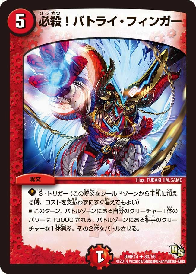 S・トリガー(この呪文をシールドゾーンから手札に加える時、コストを支払わずにすぐ唱えてもよい)このターン、バトルゾーンにある自分のクリーチャー1体のパワーは+3000される。バトルゾーンにある相手のクリーチャーを1体選ぶ。その2体をバトルさせる。
