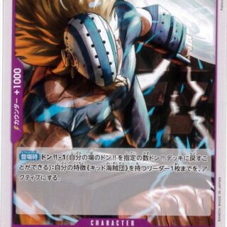 テキスト:【速攻】(このカードは登場したターンにアタックできる)【登場時】自分のリーダーかキャラ1枚にレストのドン!!2枚までを、付与する。