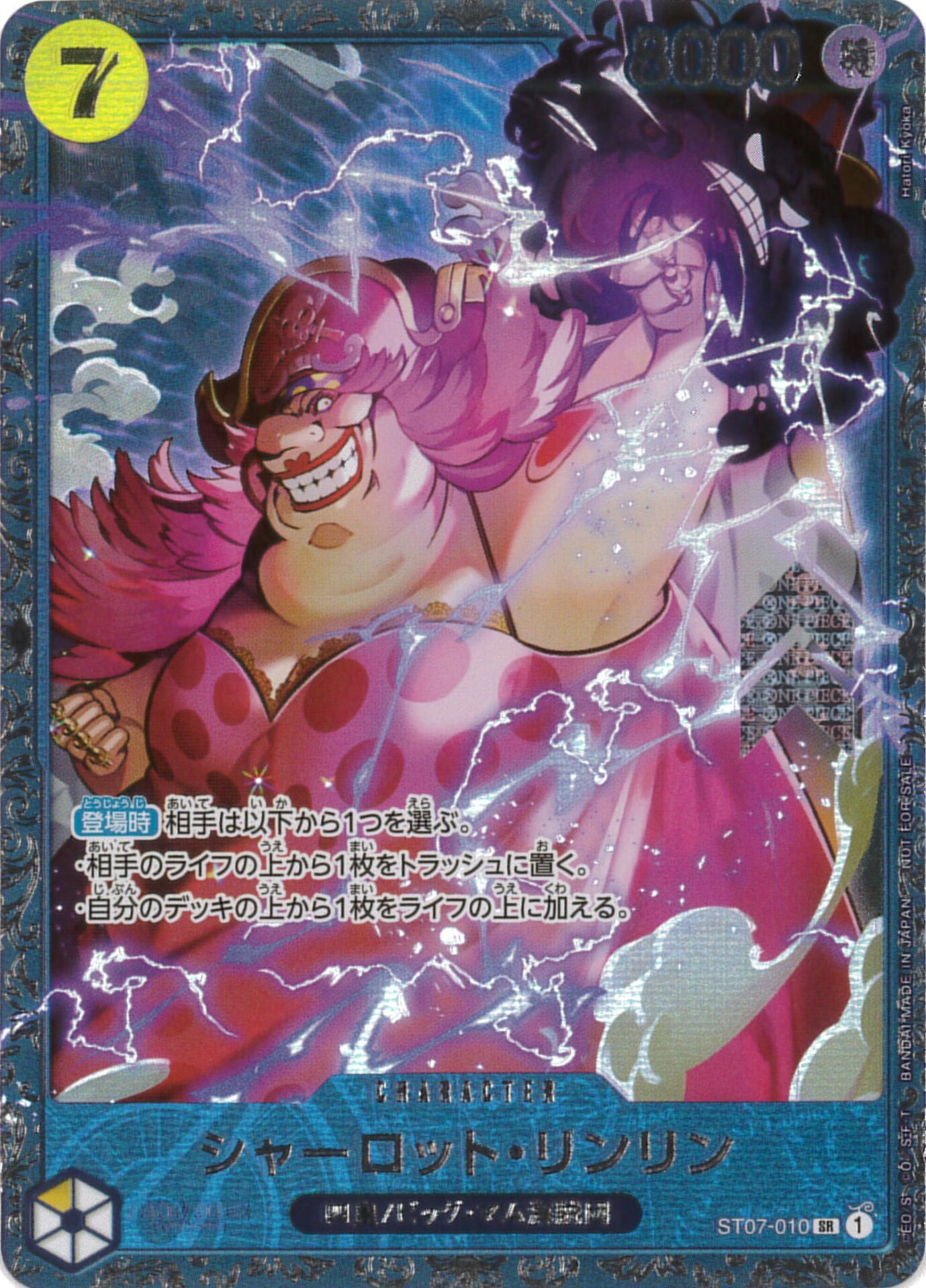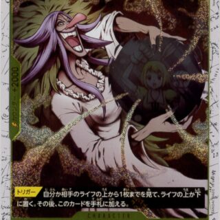 テキスト:【登場時】ドン!!-1,自分の手札1枚を捨てることができる:自分のデッキの上から1枚までを、ライフの上に加える。その後、相手のコスト6以下のキャラ1枚までを、相手のライフの上か下に表向きで加える。